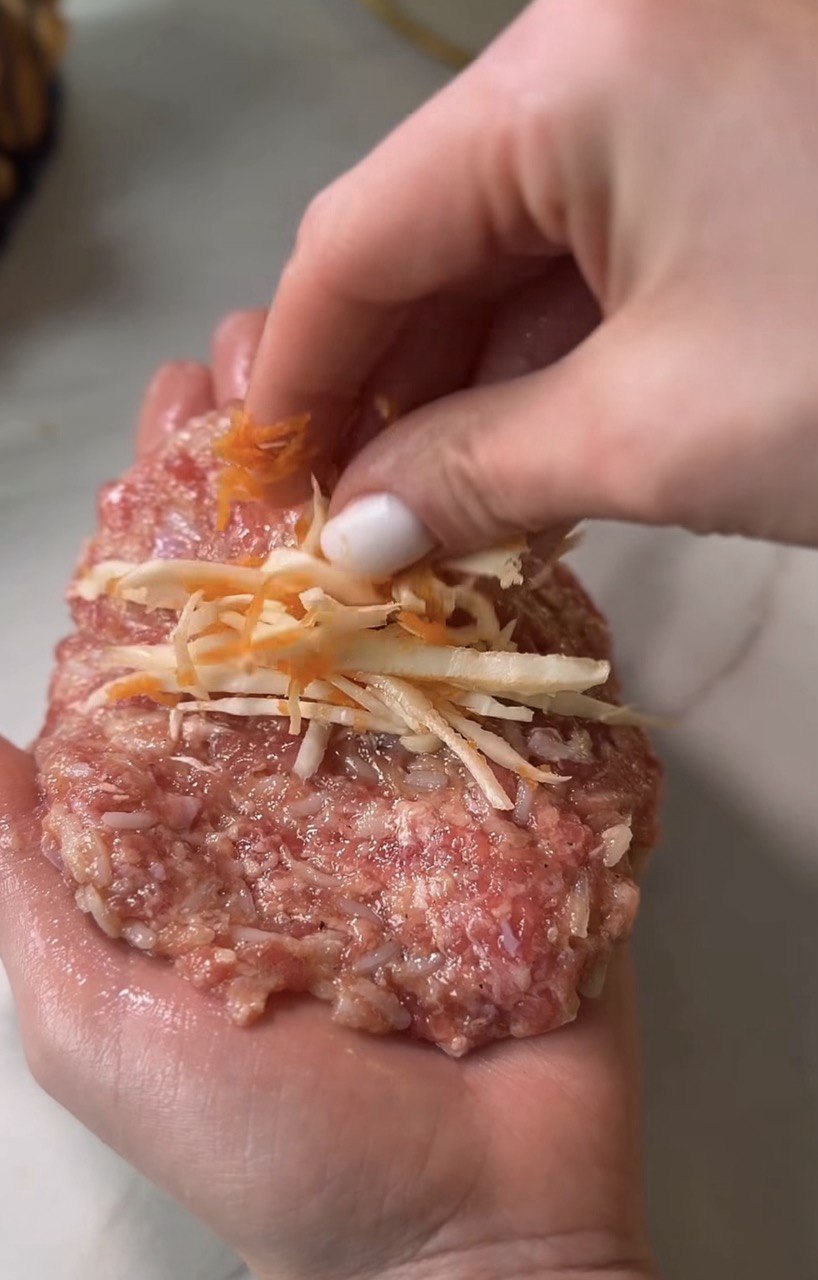 З фаршу зробіть котлети і в середину покладіть капусту з морквою. Обсмажте до золотистості з обох сторін.