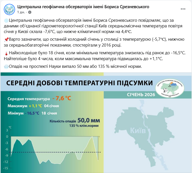 Атмосферні явища столиці за січень 2026 року (скриншот: facebook.com/CGO.Official)