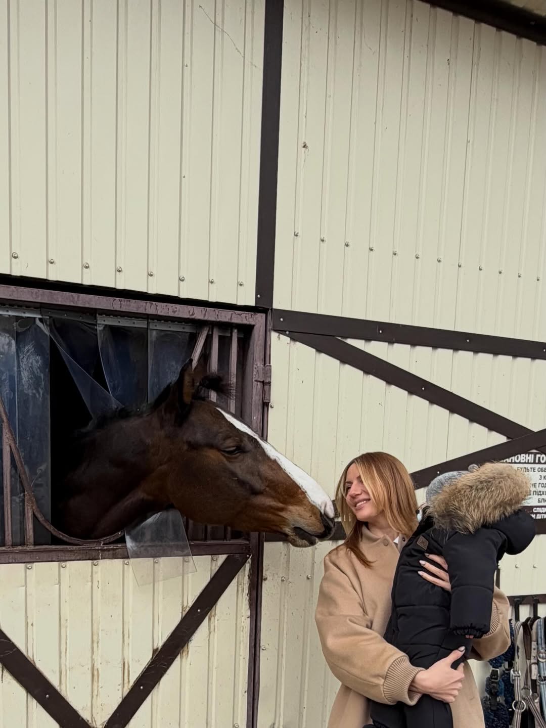 Окрім домашніх розваг, зіркова матуся влаштувала дитині цікаву прогулянку. На фото з конюшні малюк, утеплений у чорний комбінезон із пухнастим хутром на капюшоні, вперше побачив коня.