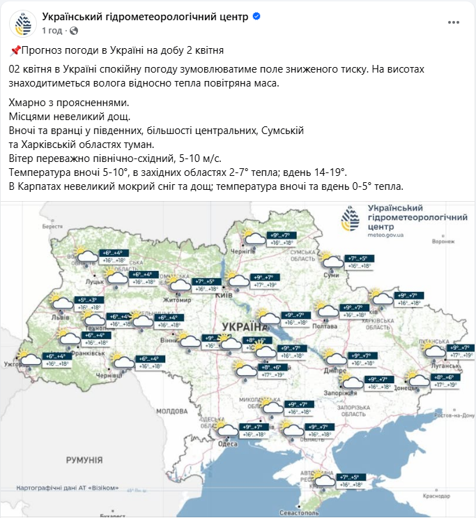 Прогноз погоди по Україні на 2 квітня (скриншот: facebook.com/UkrHMC)