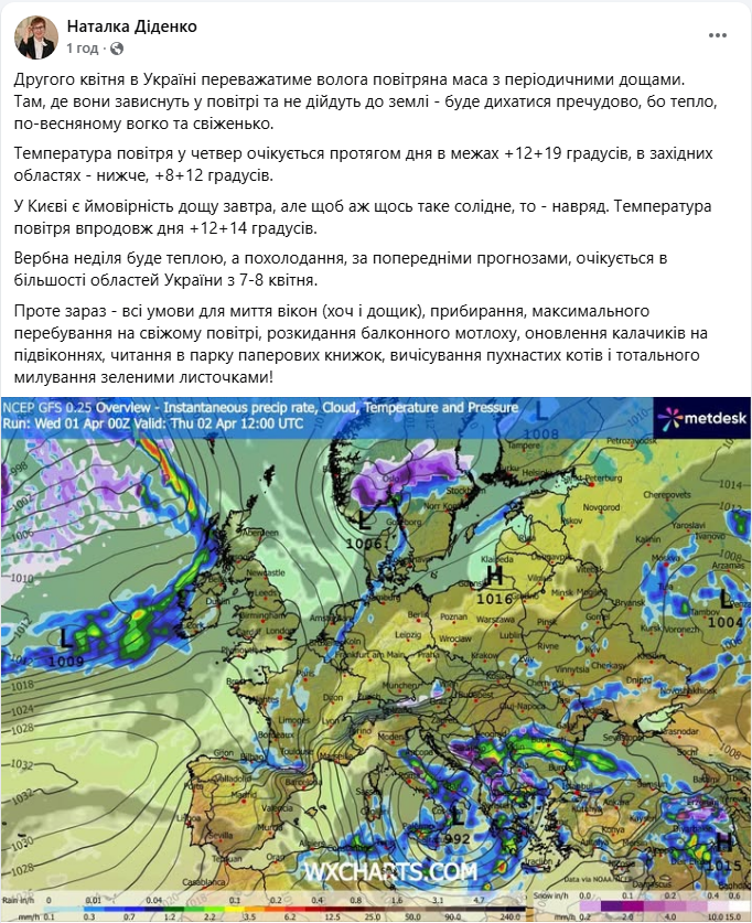 Згідно з інформацією метеоролога й синоптика Наталки Діденко, впродовж завтрашнього дня (2 квітня) в Україні переважатиме "волога повітряна маса з періодичними дощами".
