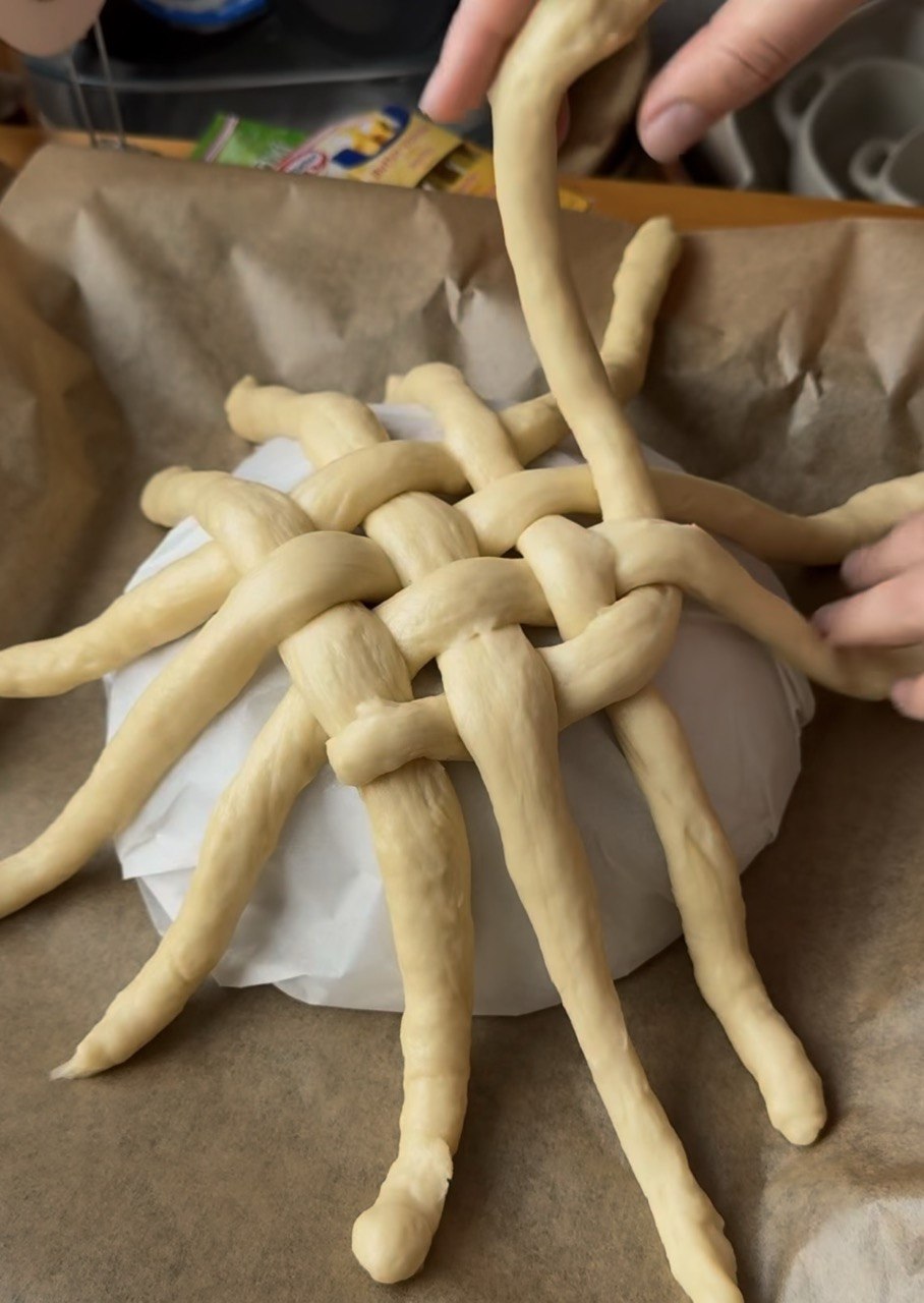 Далі сплетіть косу з тіста, яка ручкою для кошику.