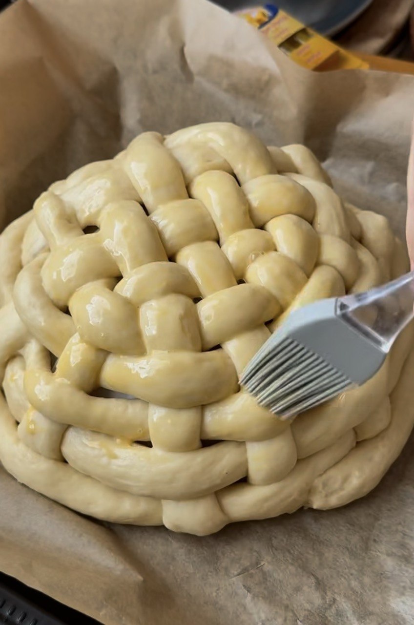 Залийте так ще на 15-20 хв для підйому. Змастіть збитим яйцем і випікайте при 180°C 30-40 хв до рум’яної скоринки.